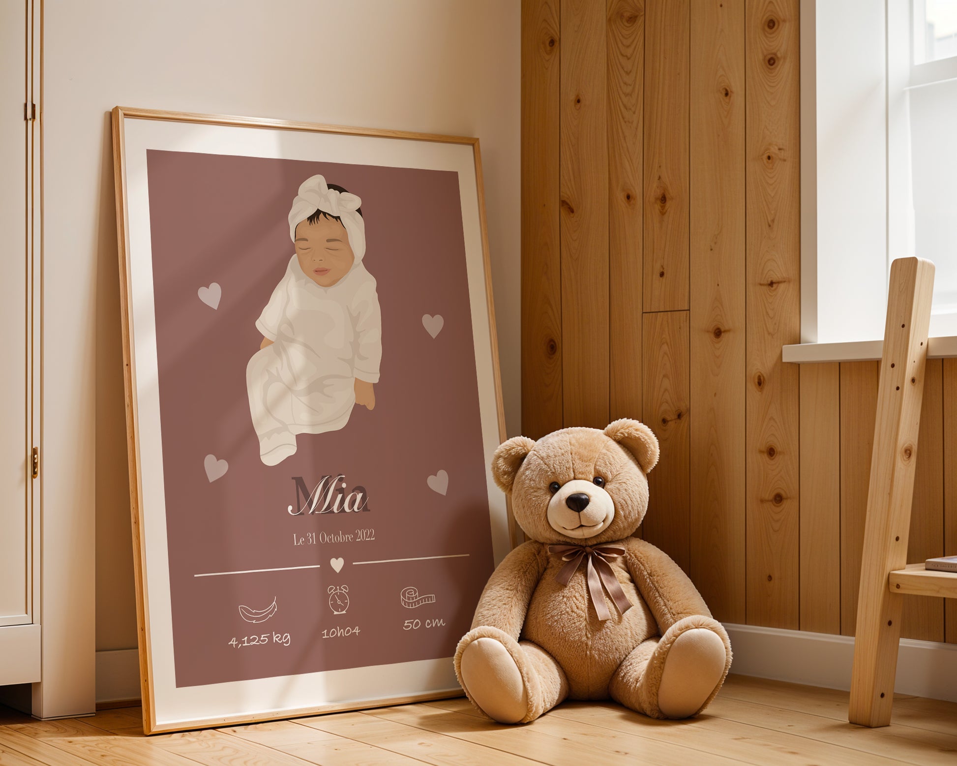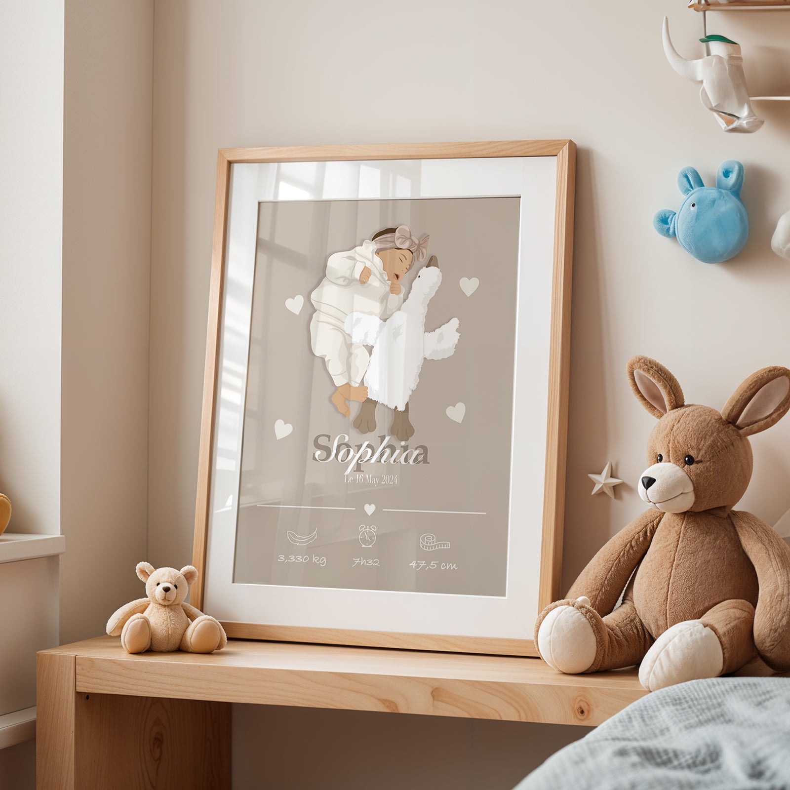 Ilustración de nacimiento totalmente personalizable, con la ilustración de tu bebé y los datos que tú elijas.