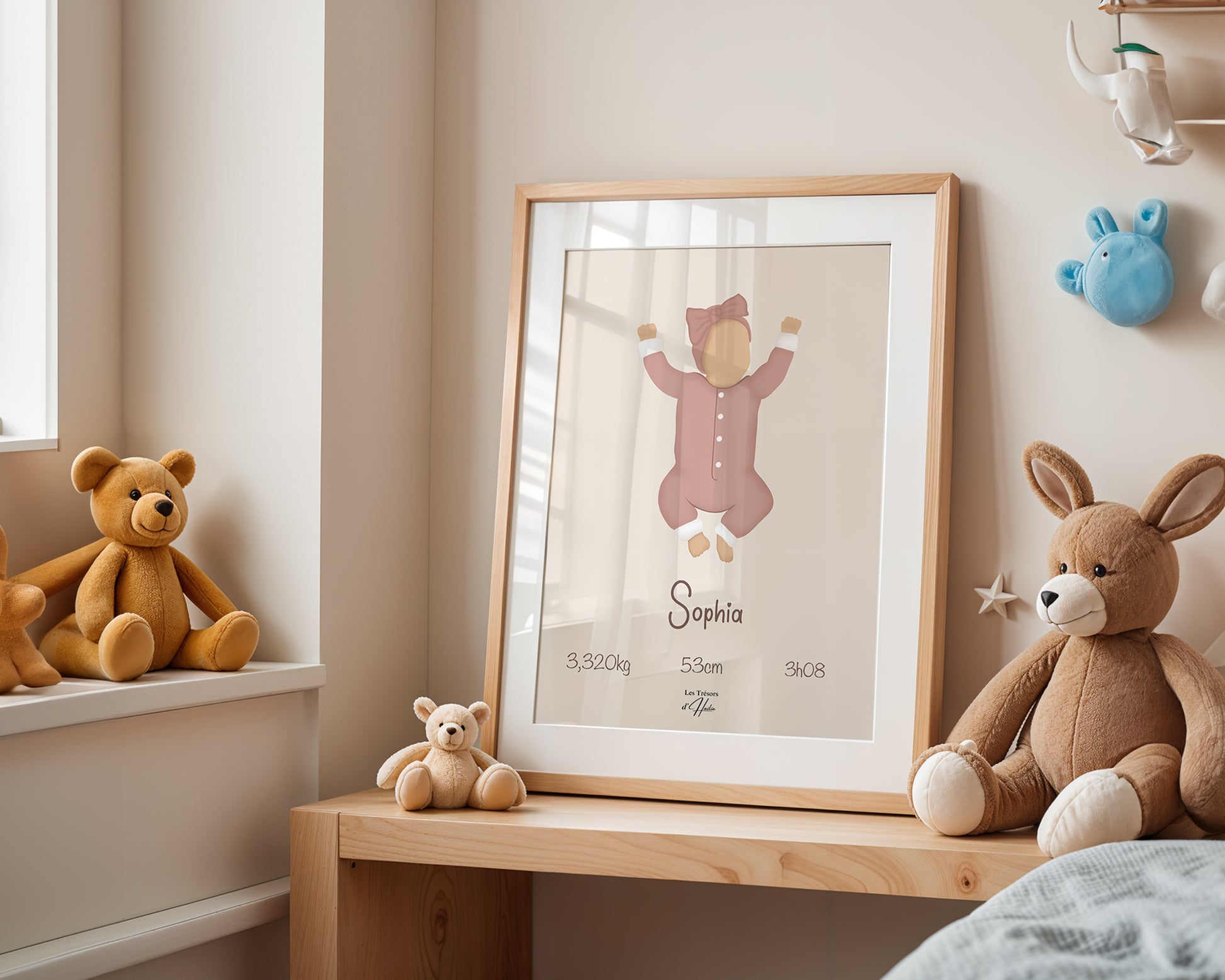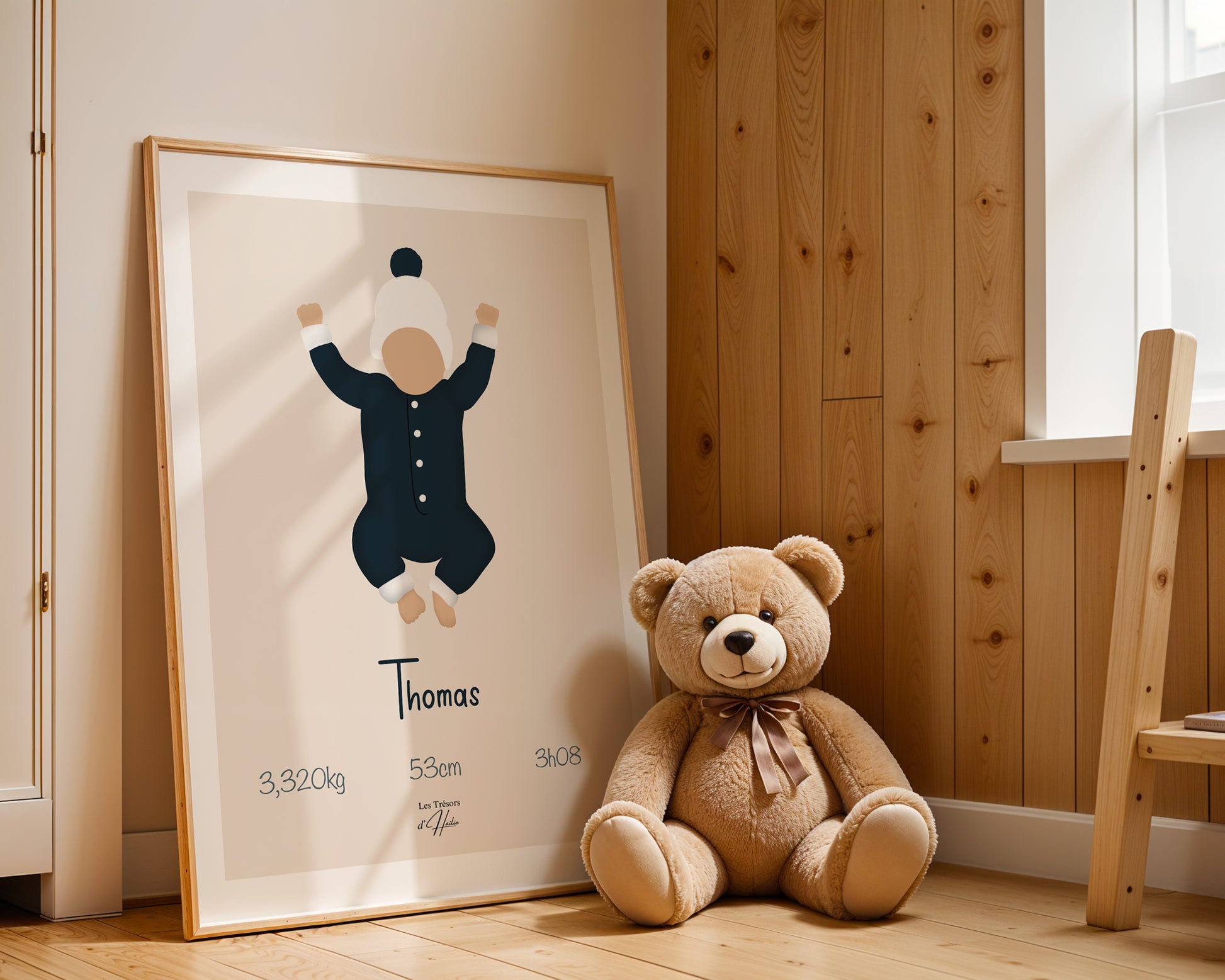 Illustration naissance entièrement personnalisable, avec l'illustration de votre bébé et des données de votre choix.